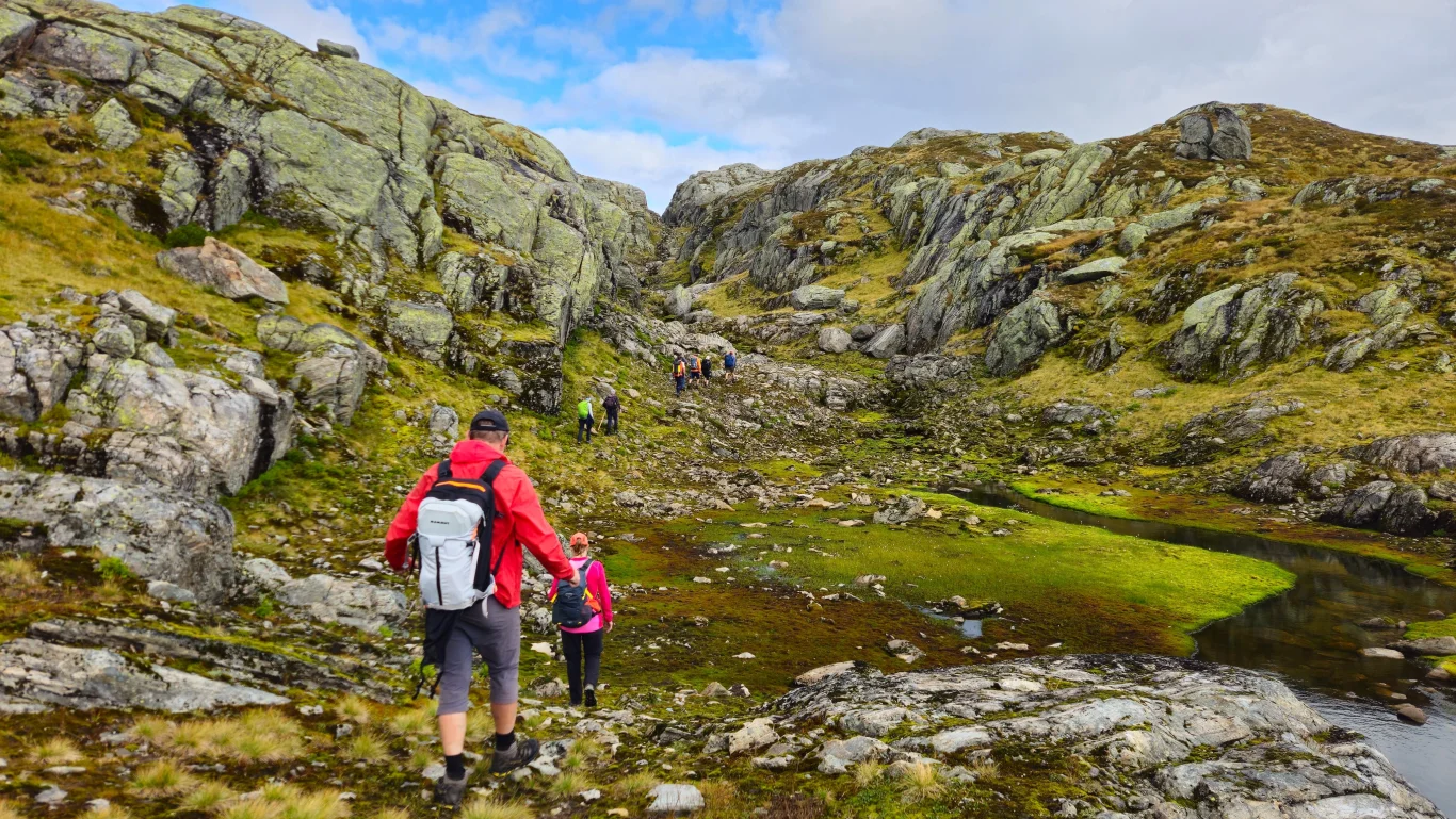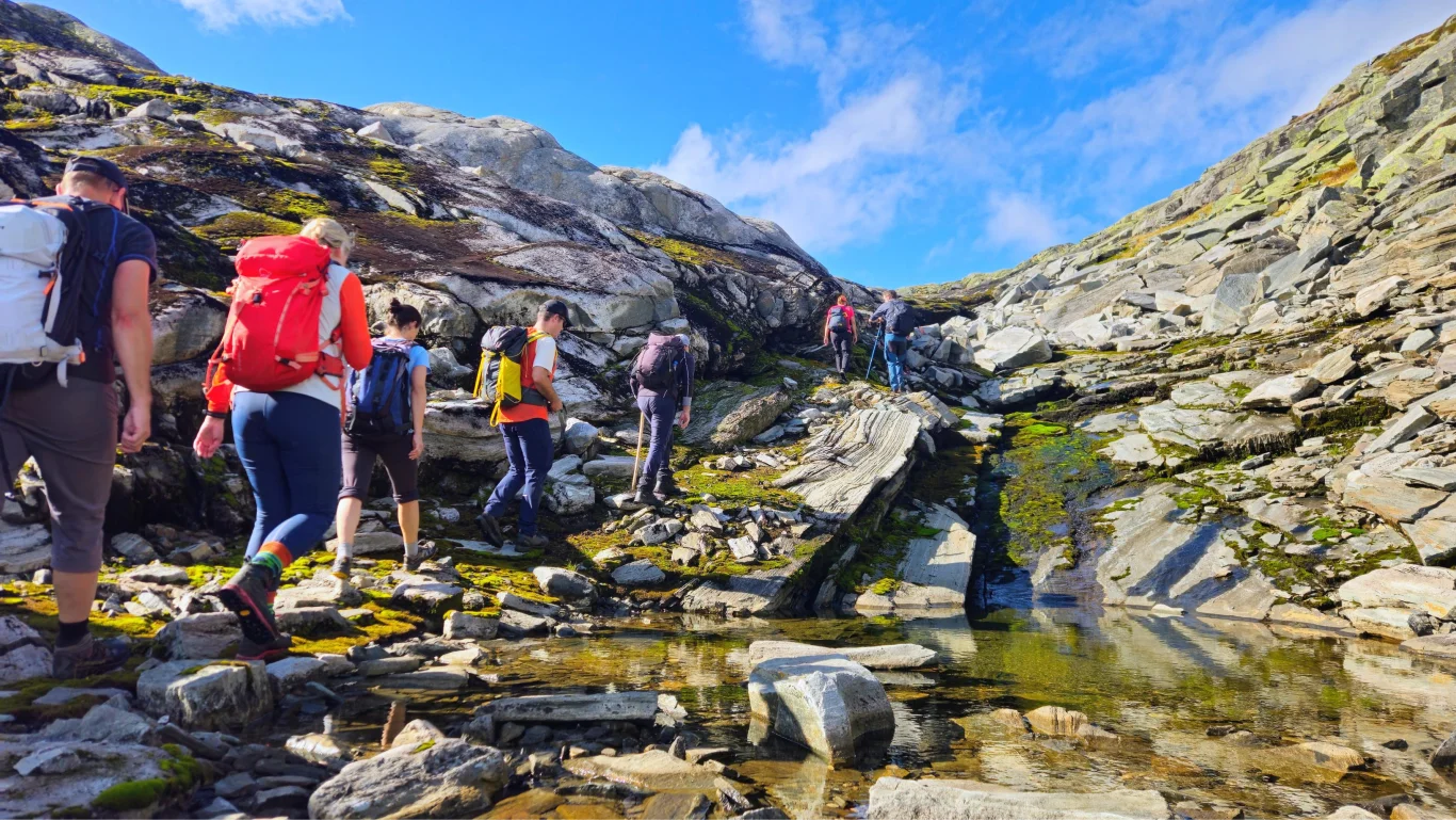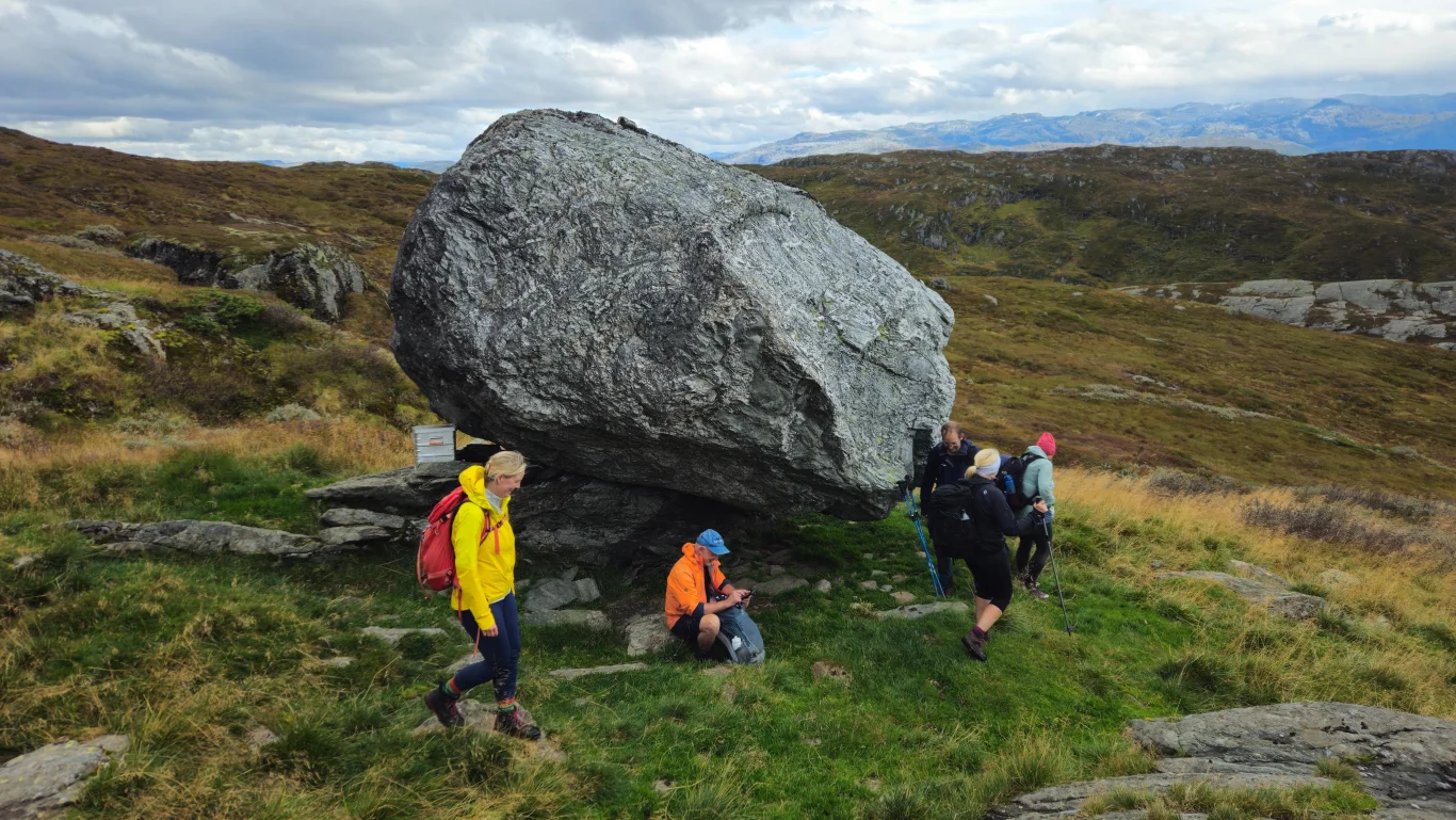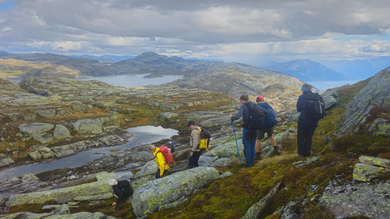 Turen byr på storslått utsikt mot Fyksefjella og utover mot Hardangerfjorden. Turen går i starten på sti og deretter delvis uten sti gjennom variert og bratt terreng. Beregn rundt 8 timer og 18 km totalt, med 1300 høydemeter opp og ned. Perfekt for erfarne fjellvandrere.