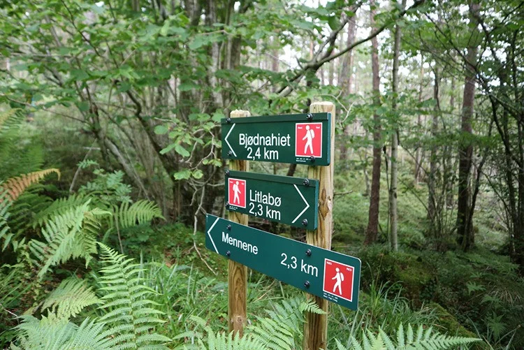 Du kommer nå til nytt stikryss hvor du skal gå rett frem skiltet "Mennene 2,3 km". Nå leder stien deg opp Bjørnastegen. Dette er en bratt steinrøys hvor du noen steder må klyve. På de verste stedene er det lagt ut tau.