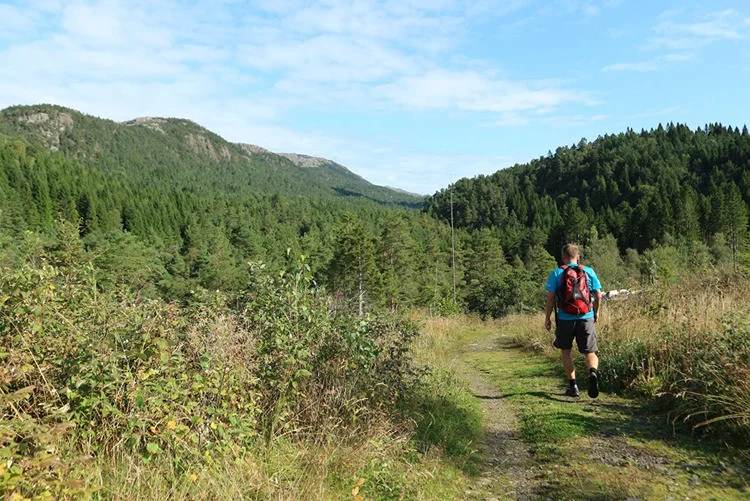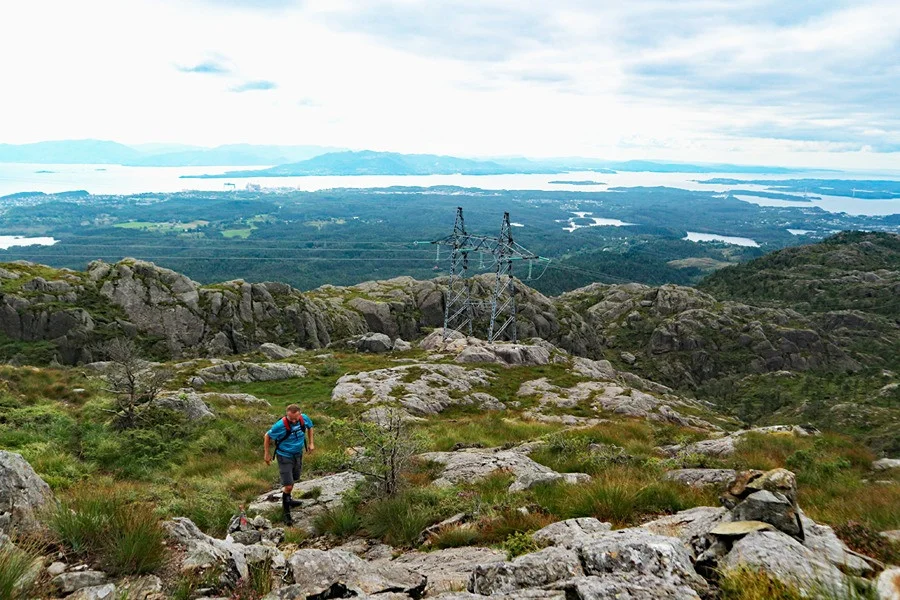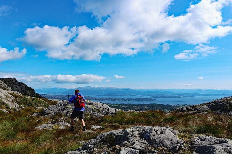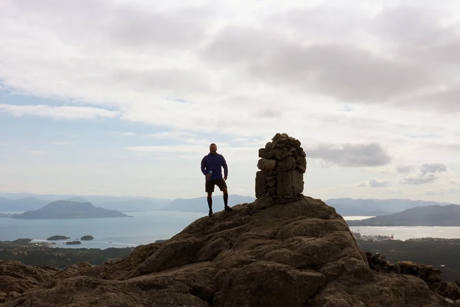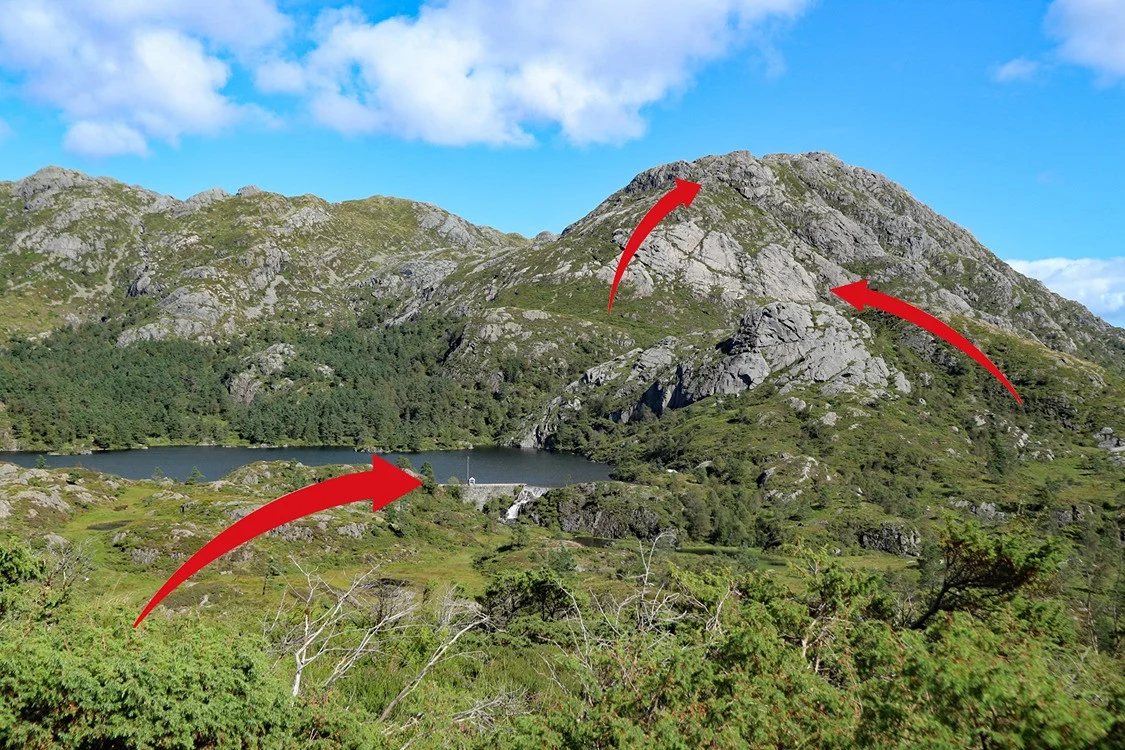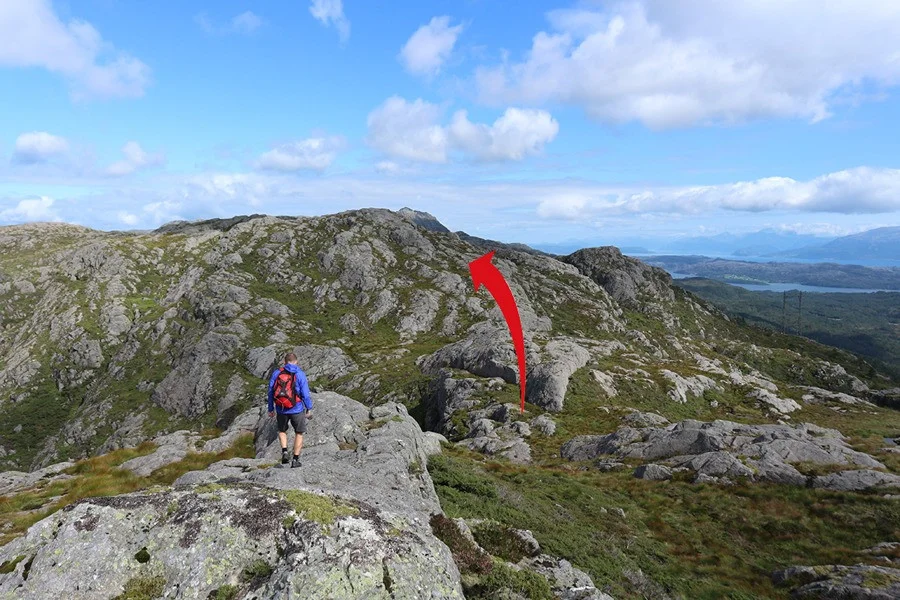 Stien leder videre på venstre side oppover, og du kommer nå over tregrensen. Nå får du fin fjordutsikt. Følg stien som er merket med små steinvarder til du ser toppvarden på venstre side.