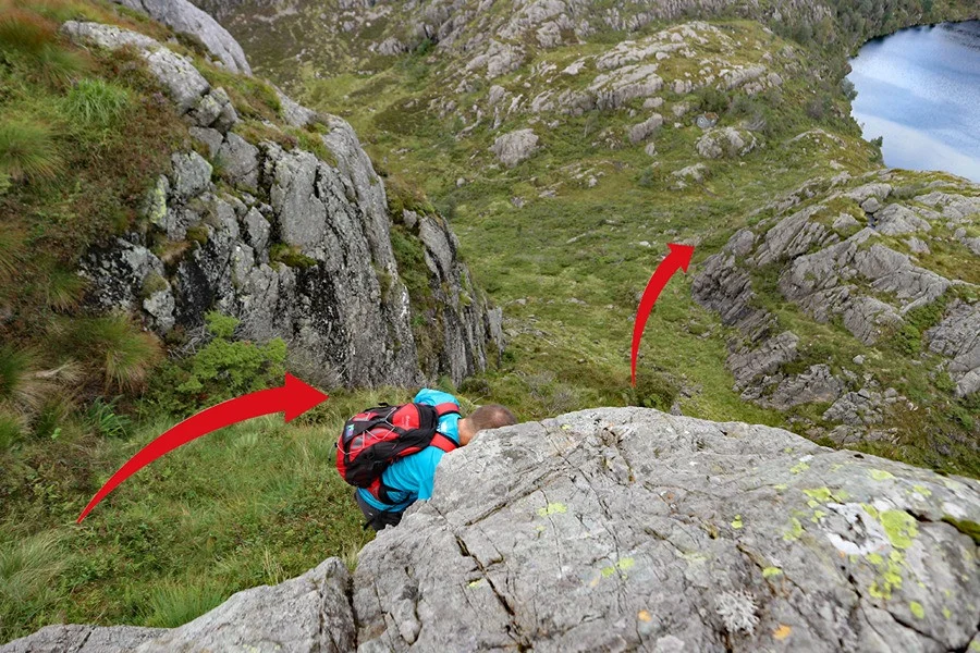 Nå starter den bratte oppstigningen til Stovegolvet. Følg stien å gå inn på avstikker stien til venstre (denne er noe utydelig, men det er rød merkepinn). Den leder deg inn på hovedstien til Stovegolvet. Følg stien til toppen av fjellet. Det er bratt og du må klyve noen steder. Men det er ingen utsatte partier.