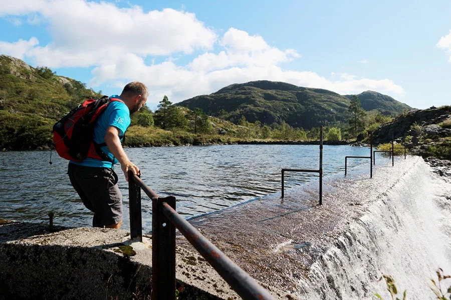 Når du har kommet ned skrenten så går du forbi hytten og til stikrysset ved Ravatnet. Her skal du gå til venstre skiltet "Lundsseter". Følg stien venstre side av vannet opp via hyttene. Her kommer nytt stikryss og du skal igjen gå til venstre skiltet "Lundsseter". Følg stien ned til Tysevatnet og til demningen. Hold deg fast i stativene når du krysser demningen. Vær forsiktig om det er mye vann.