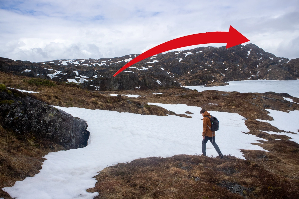 Like før vannet kommer du til stikryss med skilt merket "Raudnipa". Her skal du følge stien til venstre rundt Raudvatnet. Herfra blir stien mer utydelig men det er godt merket med rødmerkede steinvarder. Gå nordover på venstre side av vannet. Ved enden av vannet kommer nytt skilt merket "Raudnipa". Nå starter en noe bratt oppstigning til toppen av fjellet. Følg merket sti helt til topps. Pass på for glatte partier da det renner mye vann langs stien.