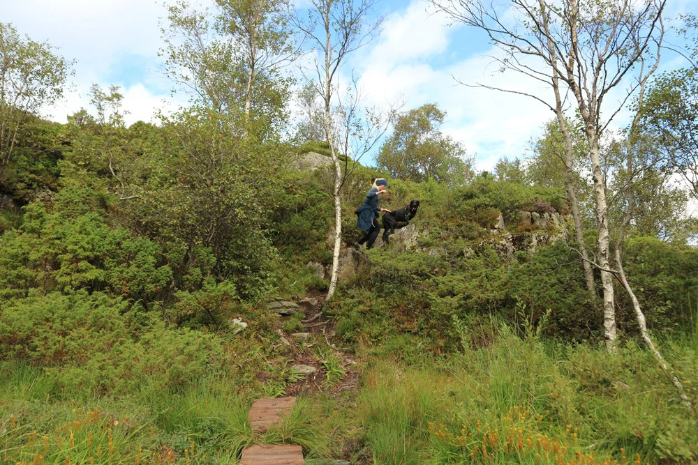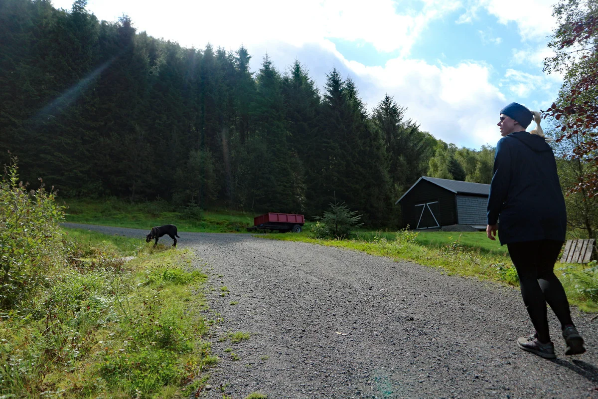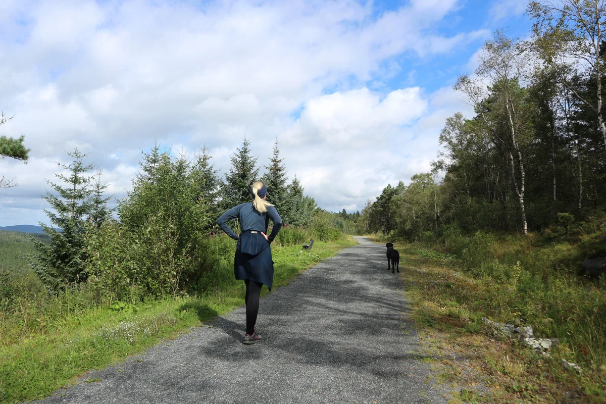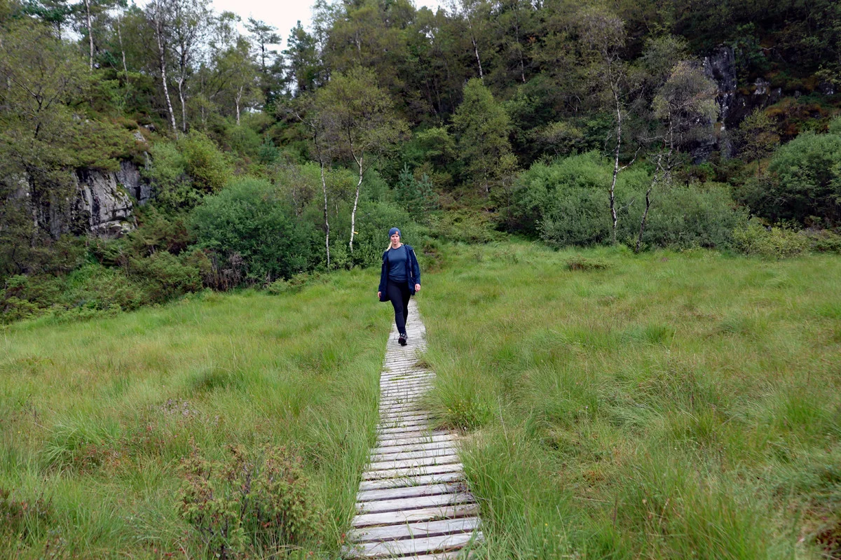 Følg stien over myren og videre inn i granskogen. Deretter er det bare å følge stien ned gjennom granskogen, over grinden og på skogsveg ned til Kaland / Kil-hallen.