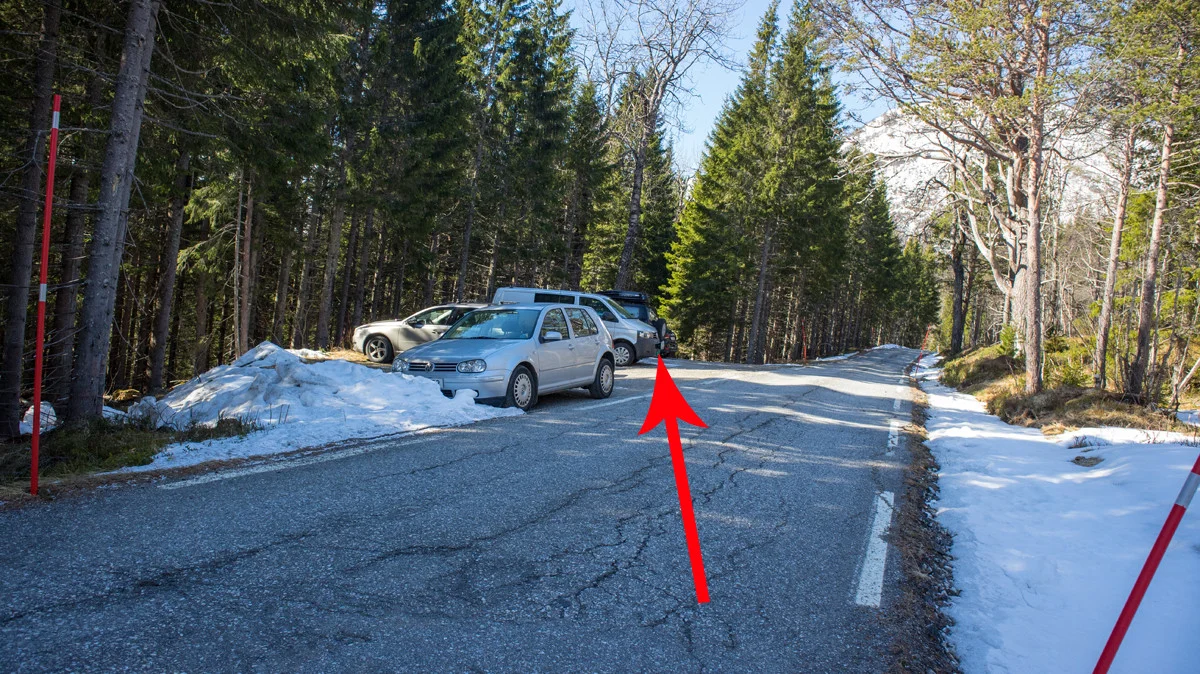 Spenn på skiene ved parkeringen om det er nok snø. Som vist på bildene var det ikke nok snø til det denne påsken (2021).