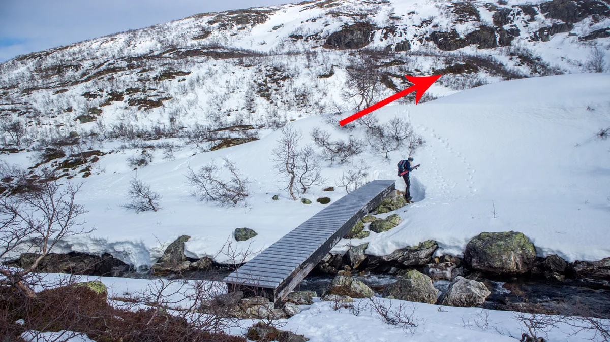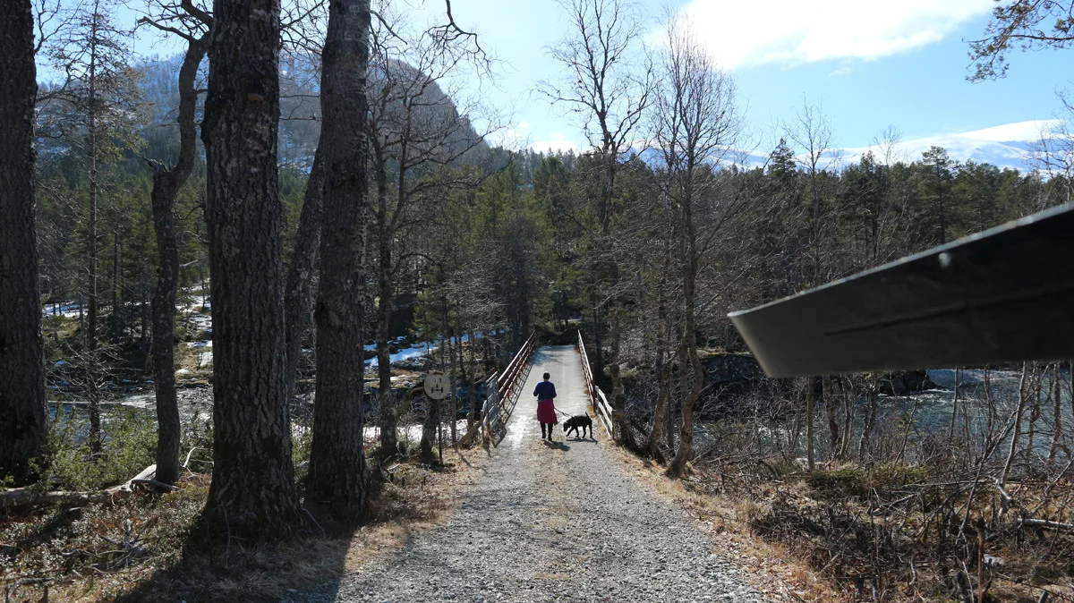 Når du har kommet opp i dalen slutter skogsveien og det flater ut. Følg dalen innover på høyre side av elven til du kommer til Rundavatnet. Gå på høyre side av vannet til du ser en hytte. Herfra forsetter du rett frem. Etter ca. 300 meter krysser du over mot venstre og renner ned mot elven. Her er det en bro.