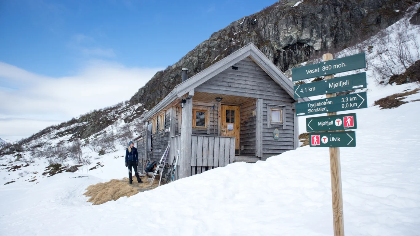 Kryss eleven og følg merket sti/ski spor rett frem til du ser hytten langs fjellsiden.