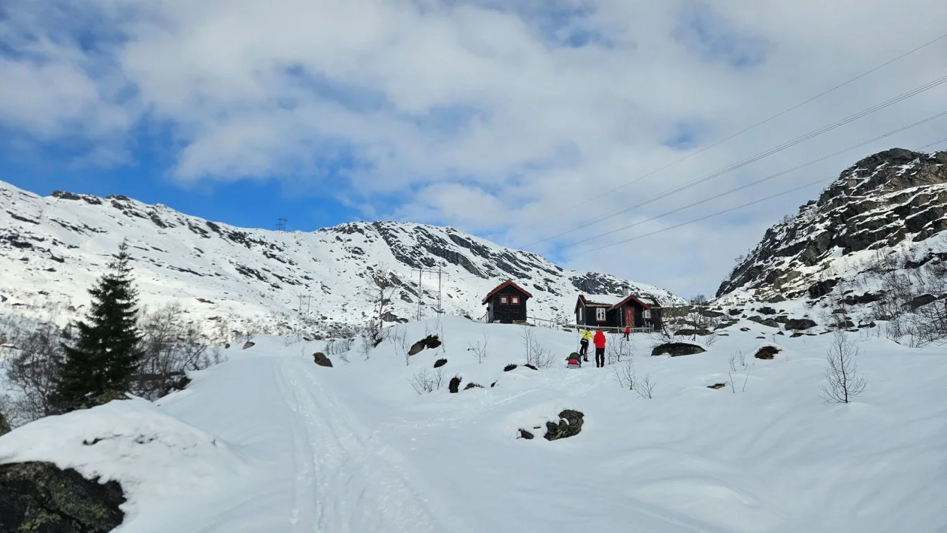 NB: På grunn av lite snø denne sesongen gikk vi på ski helt opp til demningen. Vanligvis går de lokale på ski opp anleggsveien til skiltet ved Haugastølen. Herfra fortsetter de nordover opp Tverrfjelldalen og videre på høyre side opp Giljaneskaret. Derfra kommer de opp til Skjerjavassvatnet, eller Skjerjavasstjørni, som kartet viser.