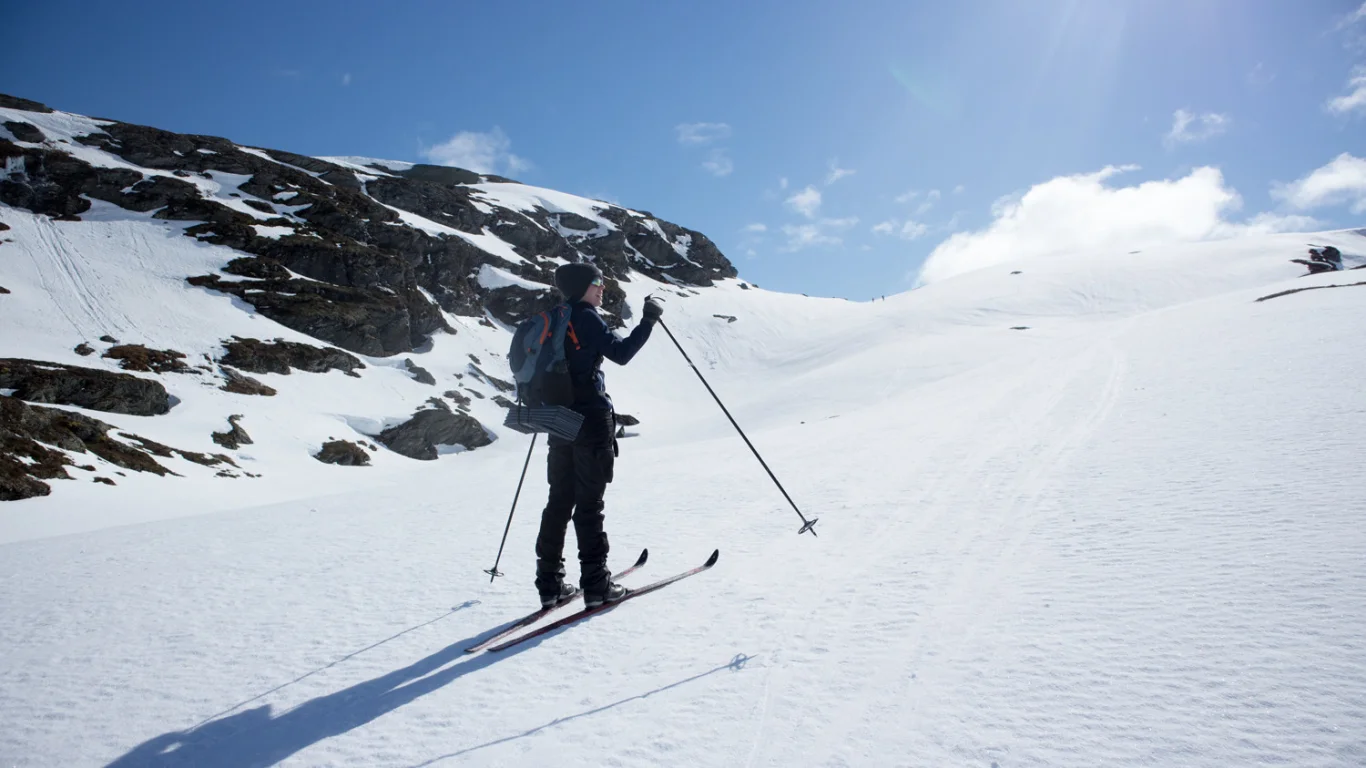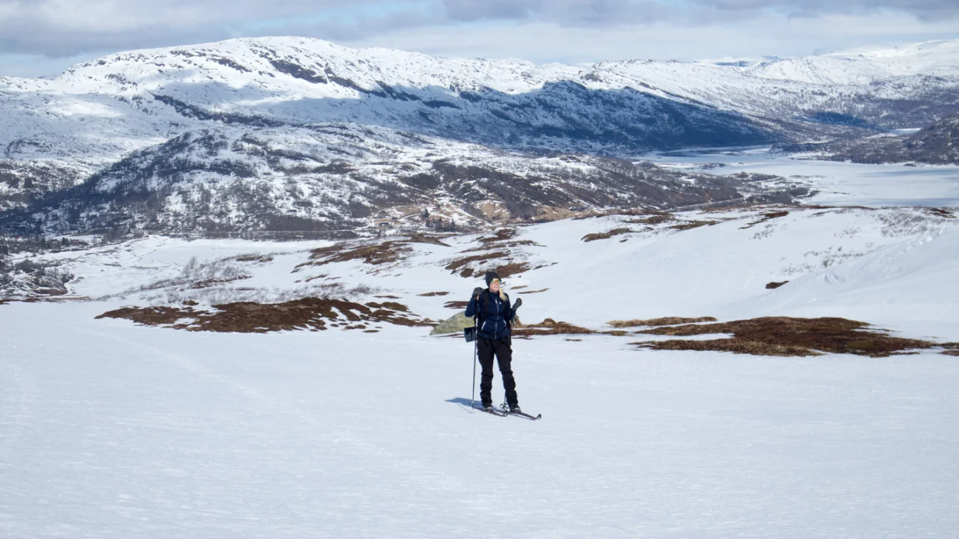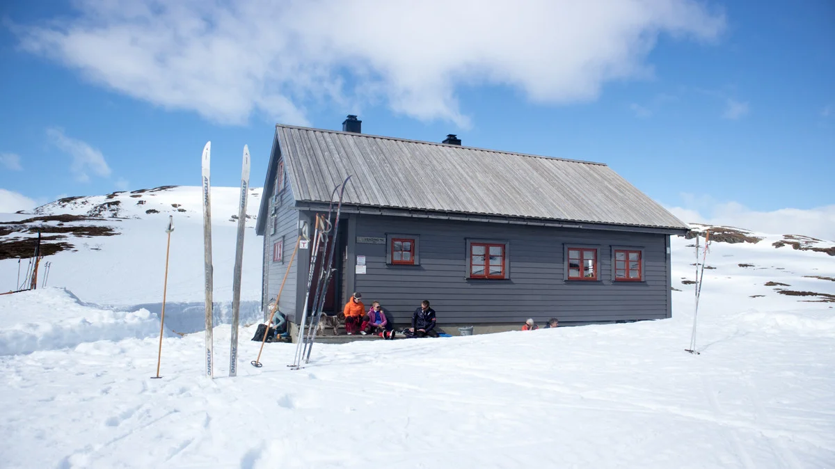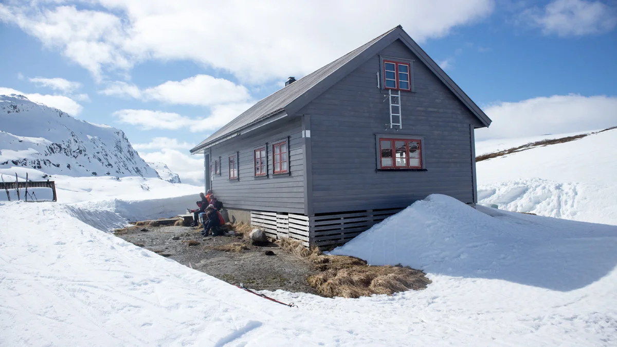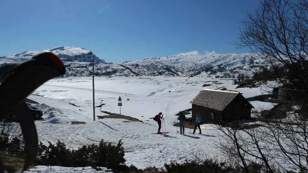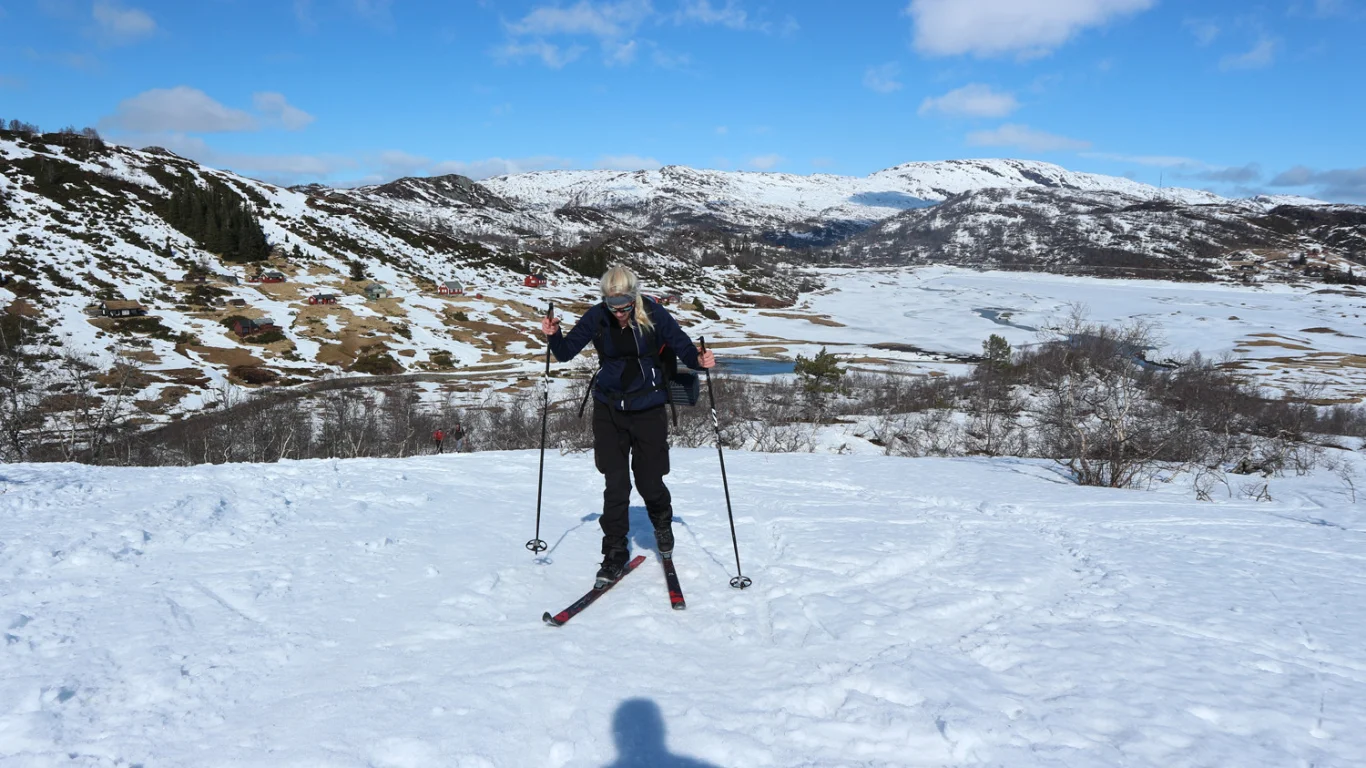 Du kan også gå på ski nede i dalen til høyre slik vi har gjort. I enden av dalen går du opp og krysser Langagjelet ved å gå fjellovergangen ned til Vending. Fra toppen kan du se hytten på lang avstand. Her er det bare renne ned til hytten.