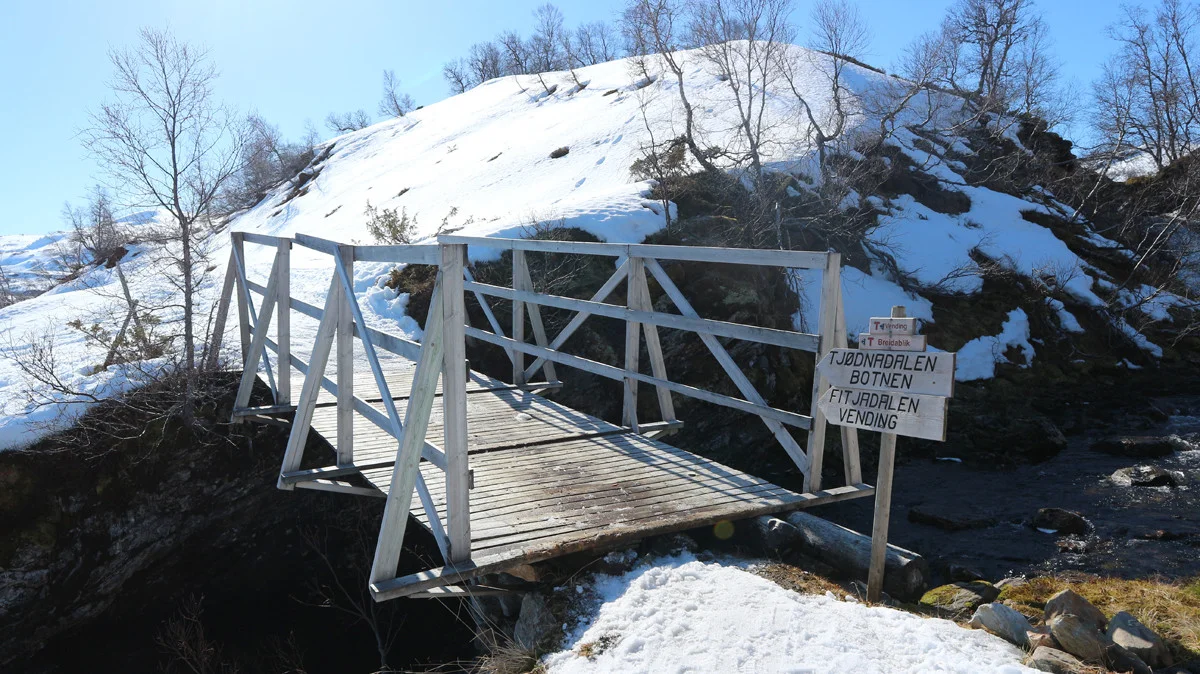 Følg stien på høyre side av elven og kryss broen. Herfra følger kvistet løype sørover.