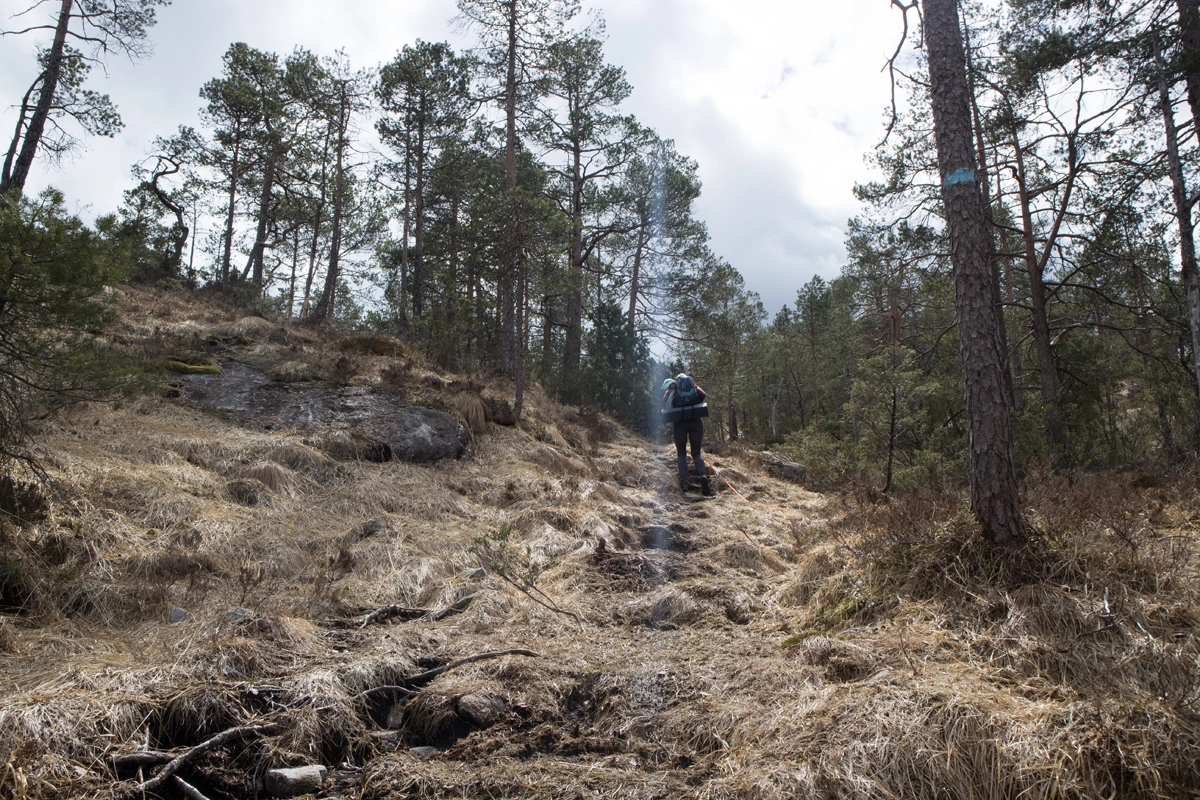 Fra veien går du inn på stien skiltet "Slottet". Følg stien oppover skråningen mot sør-vest. Gå forbi den store steinen og kryss den lille eleven. Det er jevn stigning hele veien og noe myrete i begynnelsen. Like etter eleven er det nytt skilt. Det er malt blå mærker på trærne og stien er god. Like før toppen går det nedover og man kan se fjellhyllen fra en tøff vinkel. Følg stien videre og rundt opp på baksiden av Slottet.