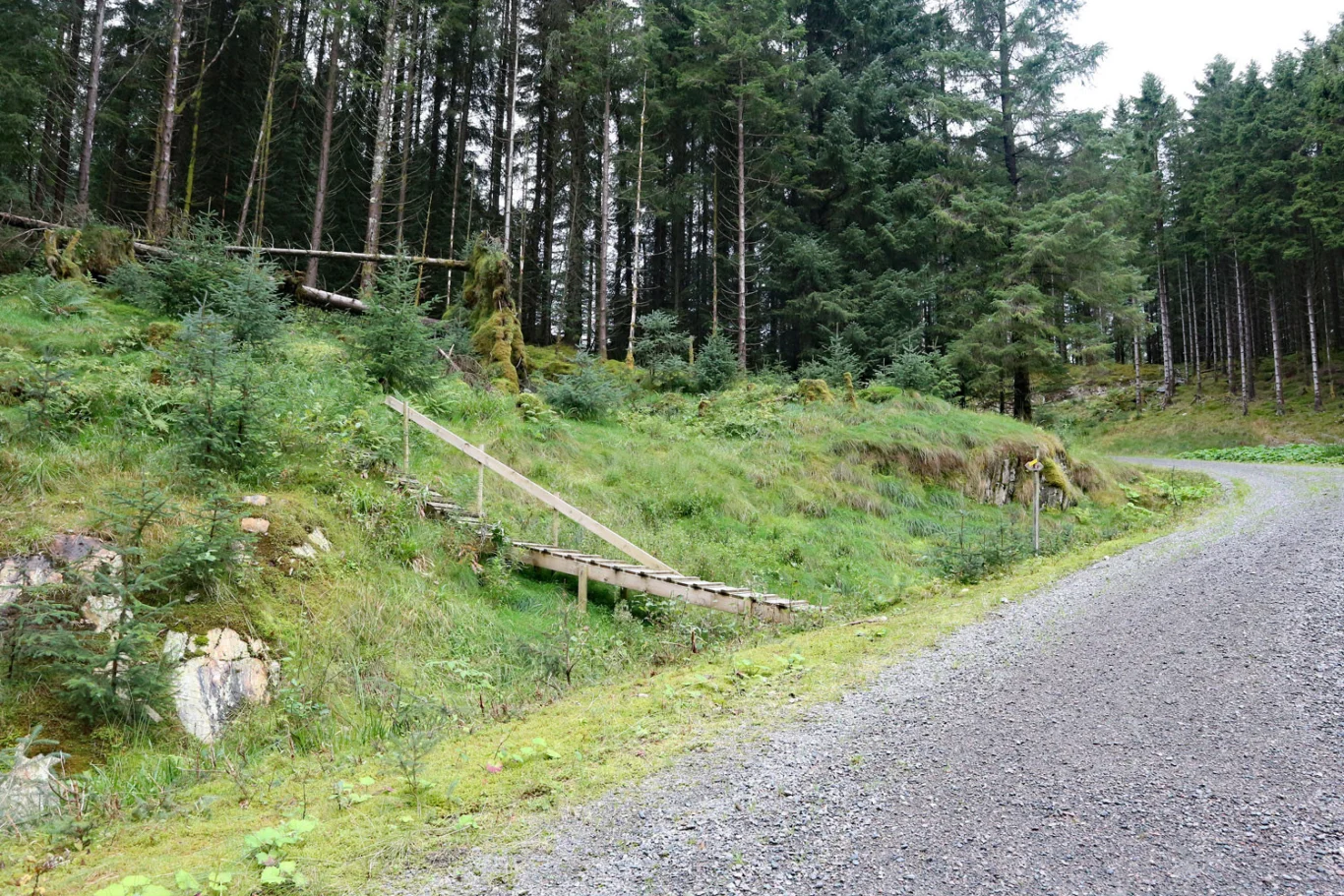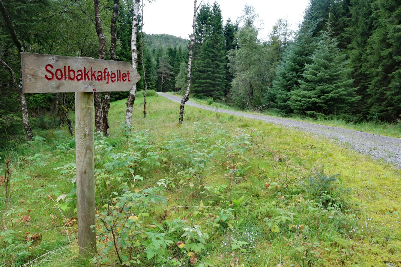 Ta bakken opp til høyre, der et skilt merket Solbakkefjellet viser vei. Grusveien slynger seg oppover og videre innover dalen til du ser den enkle trebroen på venstre side. Følg stien inn i granskogen. Hold til høyre for den store myren og gå opp bakken i enden av myren.
