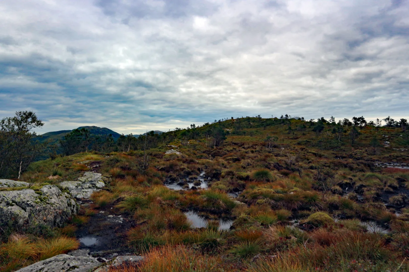 Deretter følger du stien som slynger seg i en bue opp på platået. Herfra er det bare å følge den tydelige stien videre innover. Etter hvert møter du en ny stigning som leder opp til toppplatået over tregrensen. Herfra har du fri sikt til varden på Solbakkefjellet i det fjerne.