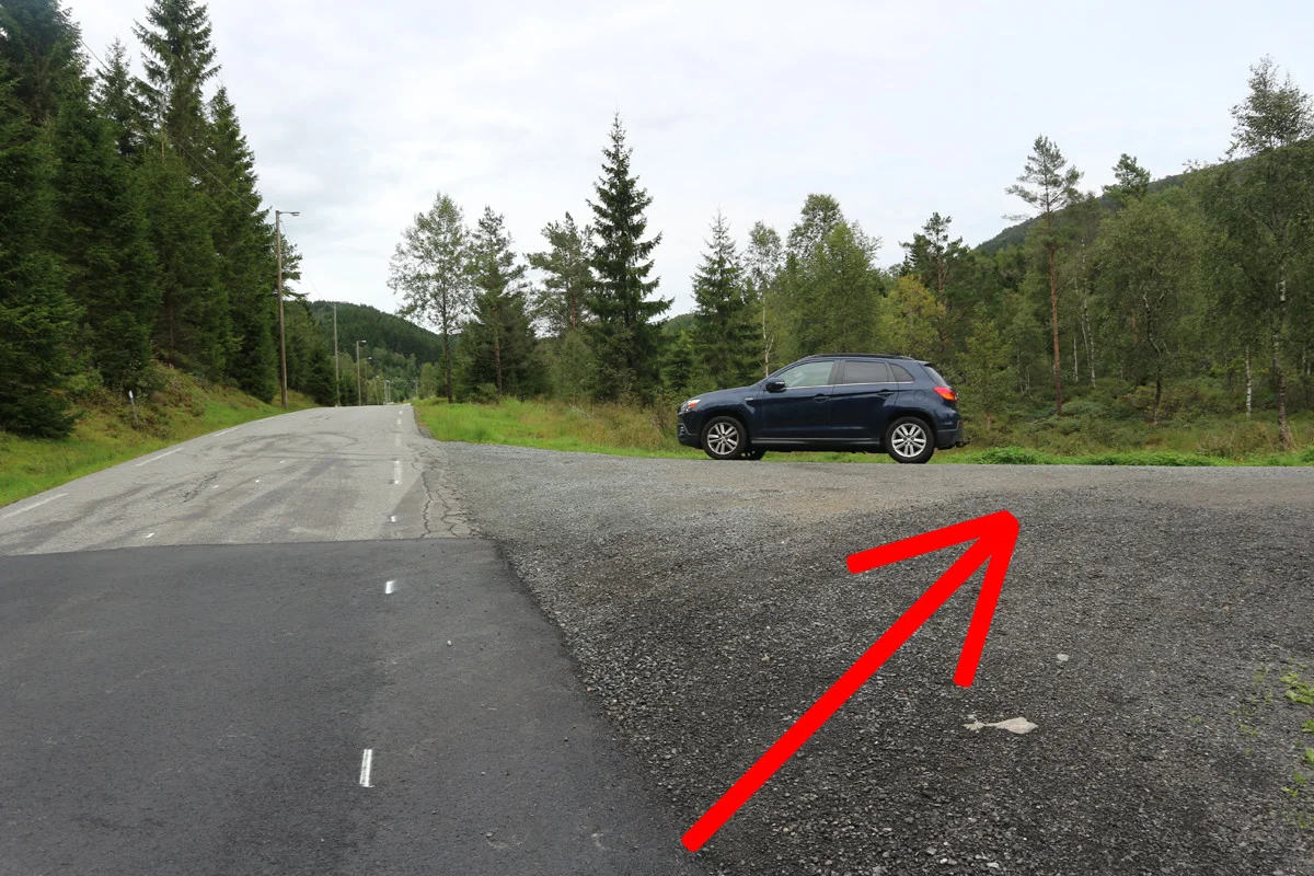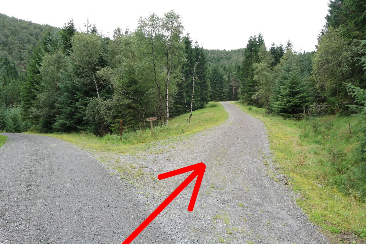 Følg grusveien (avstikker fra Bontveitveien) innover til du kommer til et kryss.