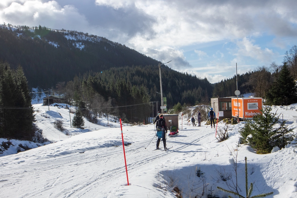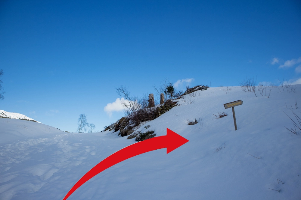 Følg stien gjennom skogen. Her er det bratt så spenn av skiene. Det kan også være isete partier så pass på. Når du kommer gjennom skogen blir terrenget mer åpent og det stigningen blir jevnere. Spenn på skiene og følg ryggen mot sørøst og deretter sørover. Det henger gule merker i trærne som viser vei. Man følger stort sett samme trase som vandreruten.