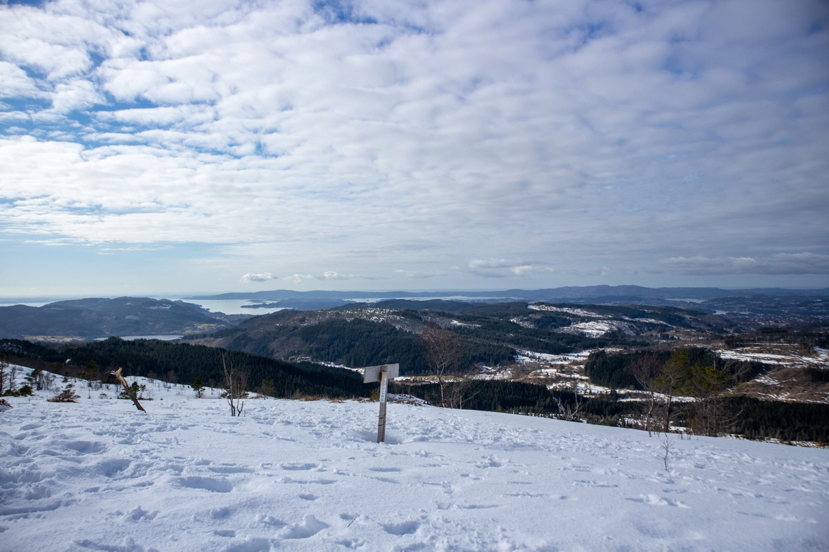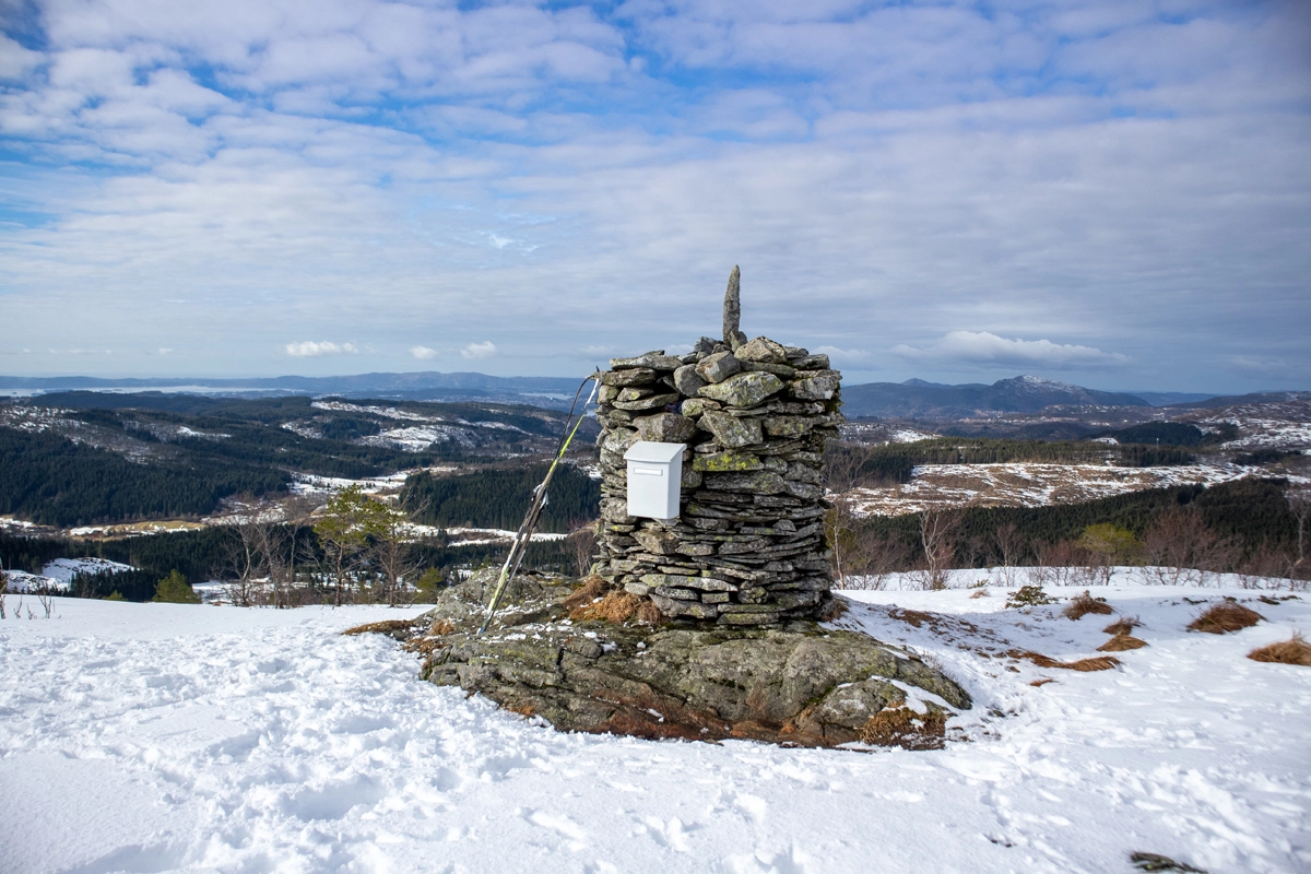 På toppen (458 moh.) er det varde med postkasse og bok. Du får flott utsikt mot Livarden, Hausdalshorga og Gullfjellet i Nord. Møsnuken og Fanafjellet i sør. I Bakgrunnen kan du skimte Folgefonna i øst og havet ut mot vest.