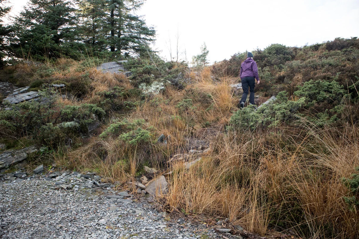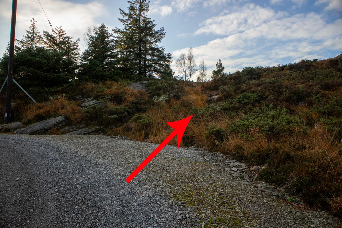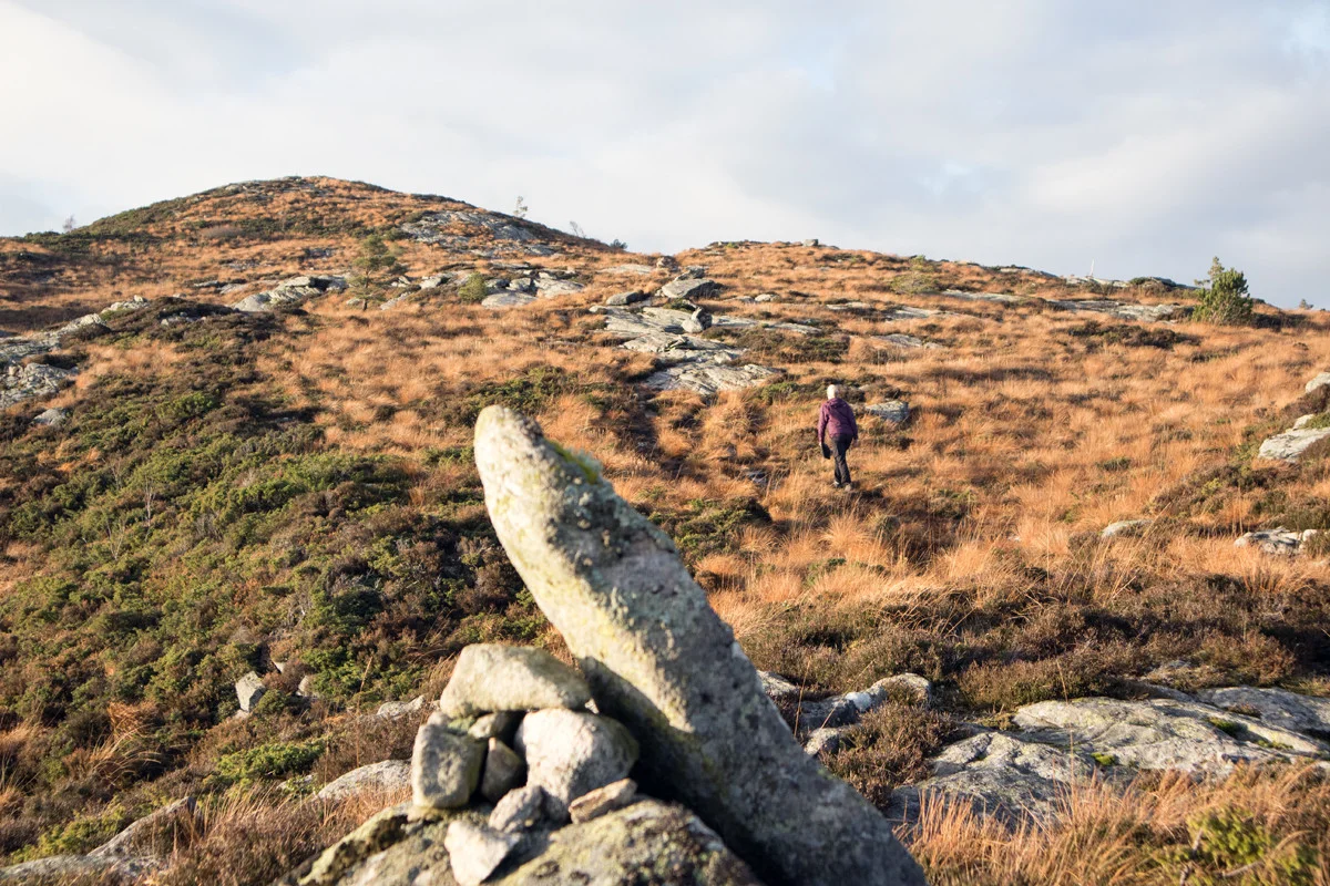Du vil se stien på høyre side (dårlig sti i starten). Følg stien oppover. Det er lite vegetasjon og det er lett å finne frem. Stien mot toppen er merket med små stein vareder. Når du kommer til første topp følger du stien nordover ca. 100 meter til toppvarden.