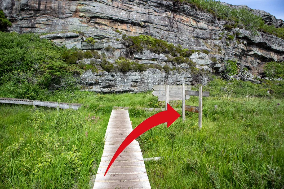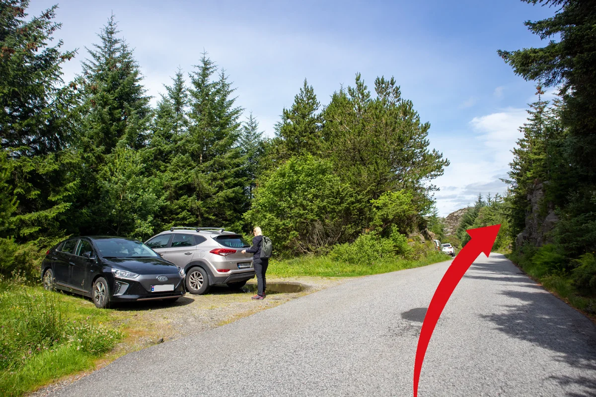 Herfra skal du følge stien nordover. Terrenget er klassisk Sotra. Ingen vegetasjon, mye stein, stup og mye vind.