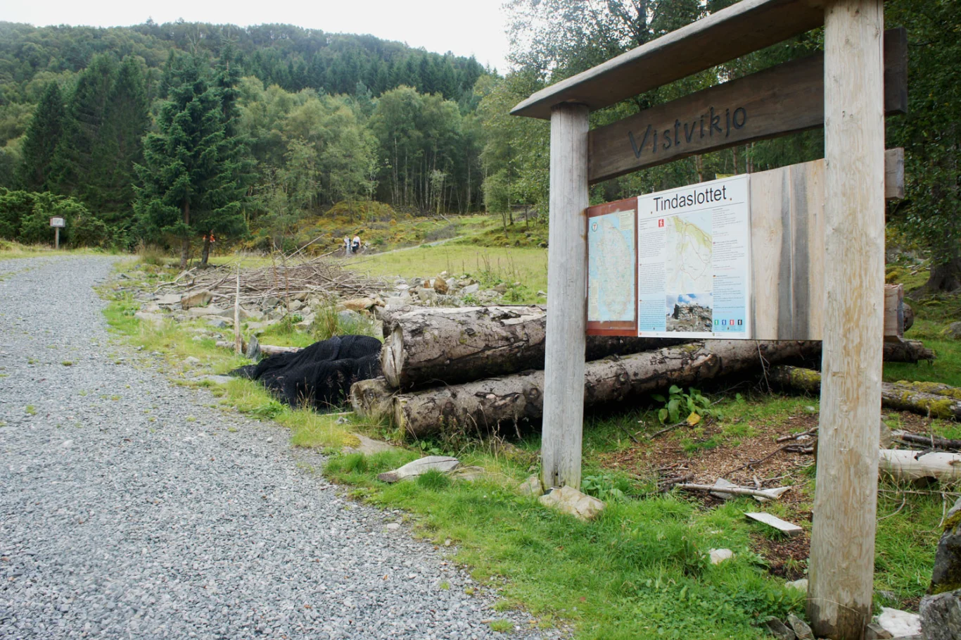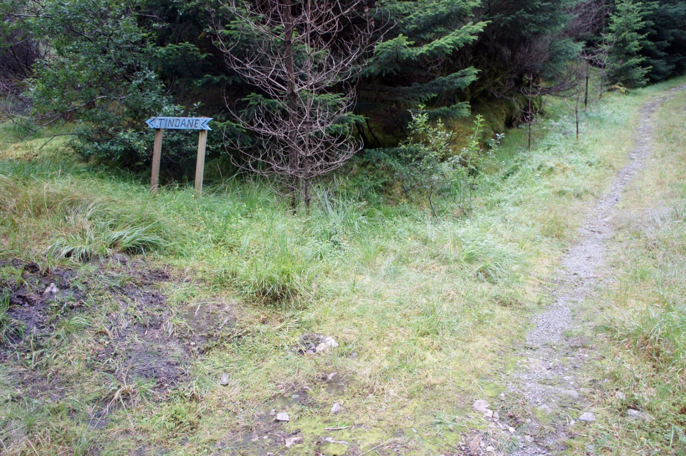 Etter et stykke ser du et skilt på venstre side merket "Tindaene". Følg denne stien sørover gjennom tett granskog og senere over myrete terreng. Deretter er terrenget åpent. Det er godt merket hele veien med blå merkepinner og små steinvarder. Du kan se toppen fra lang avstand. Siste del går på steinete underlag.