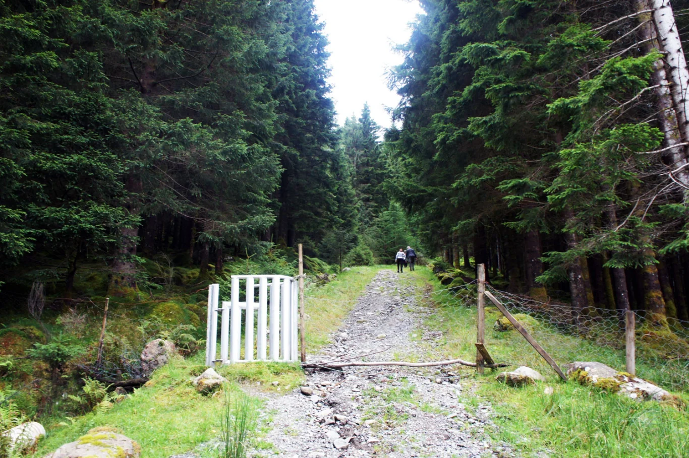 Følg skogsveien oppover, gjennom en grind og videre opp en bratt bakke.