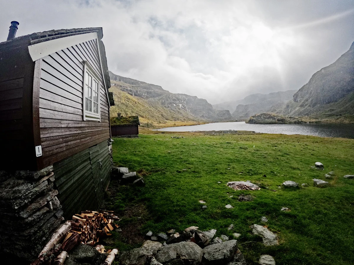 Hytta er bygget på søyler med en fantastisk panoramautsikt over Ulvik og Hardanger...