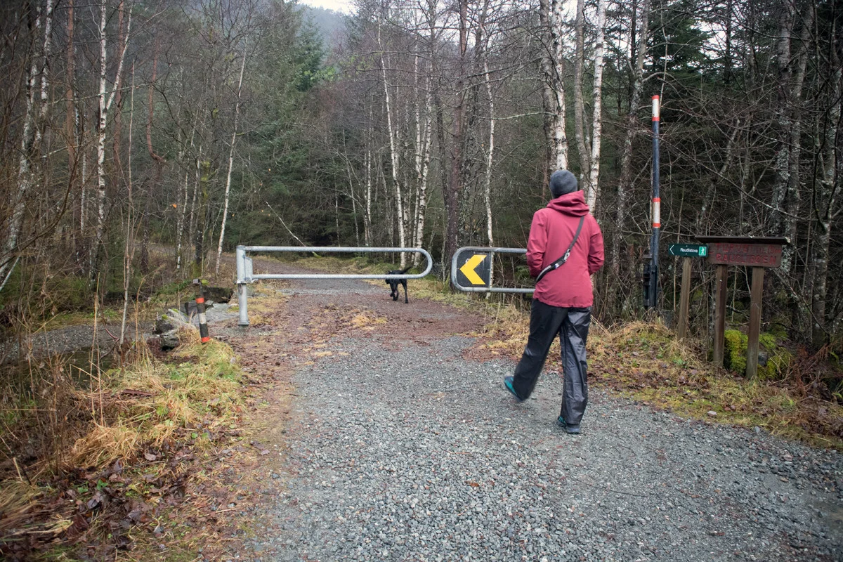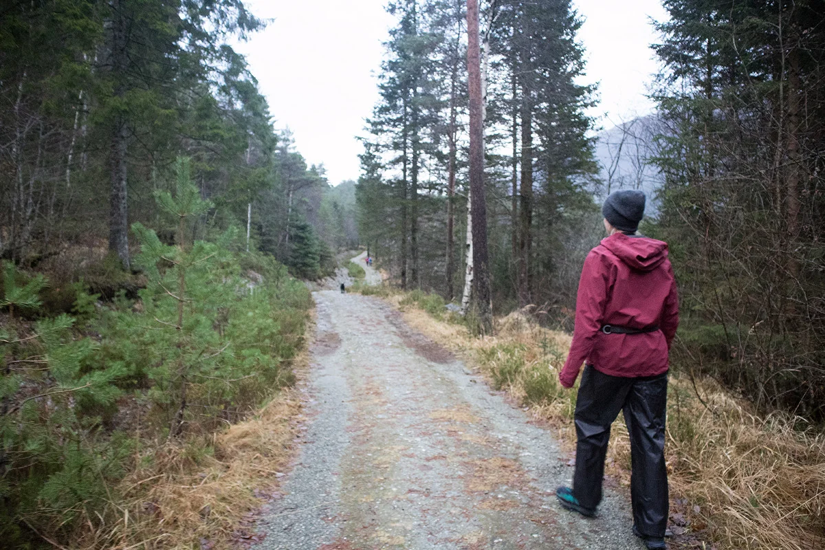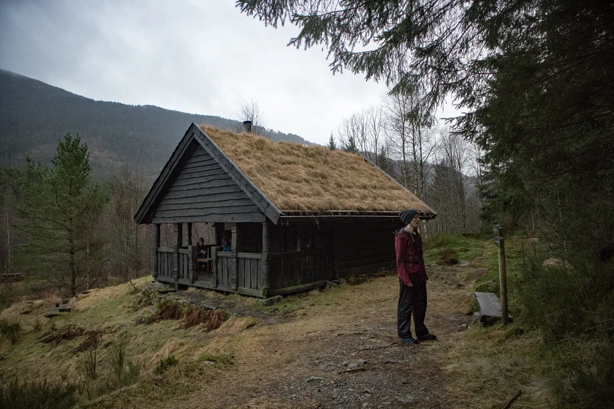 Når du kommer til toppen av bakken går du til venstre gjennom bommen. Herfra her det bare å følge grusveien til Raudlistova. Det er god vei helt frem til hytten, så turen passer også for barnevogn.