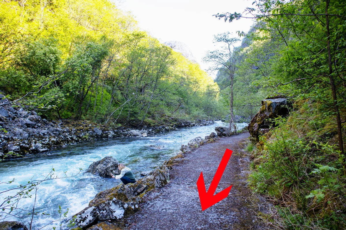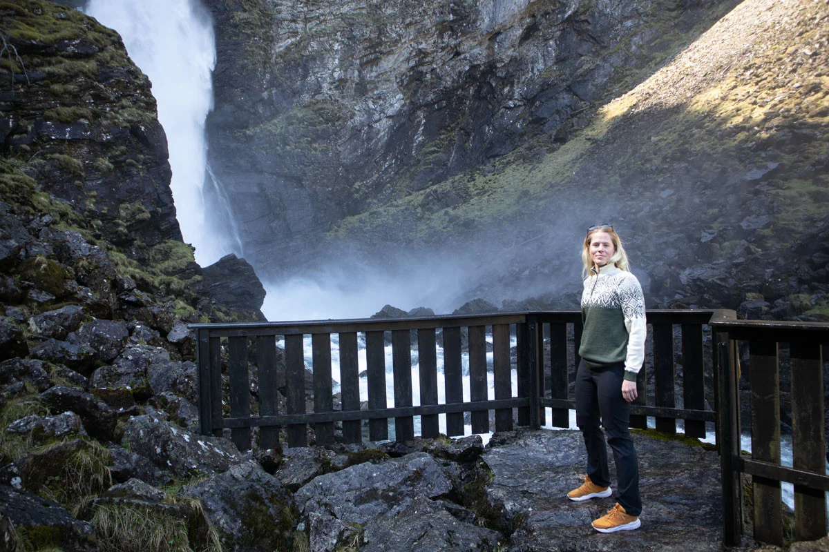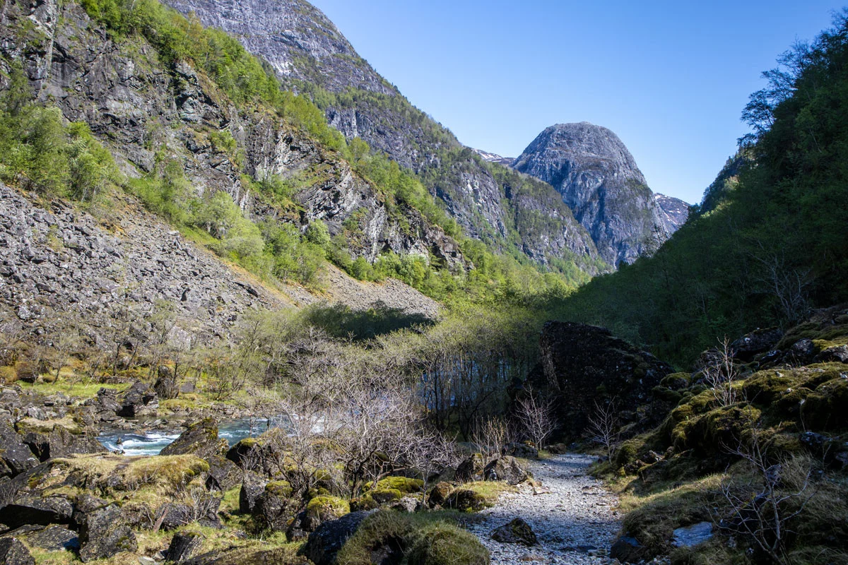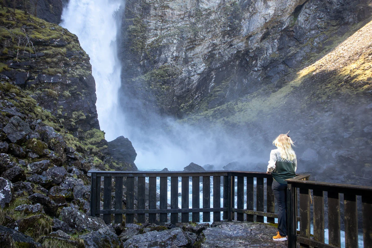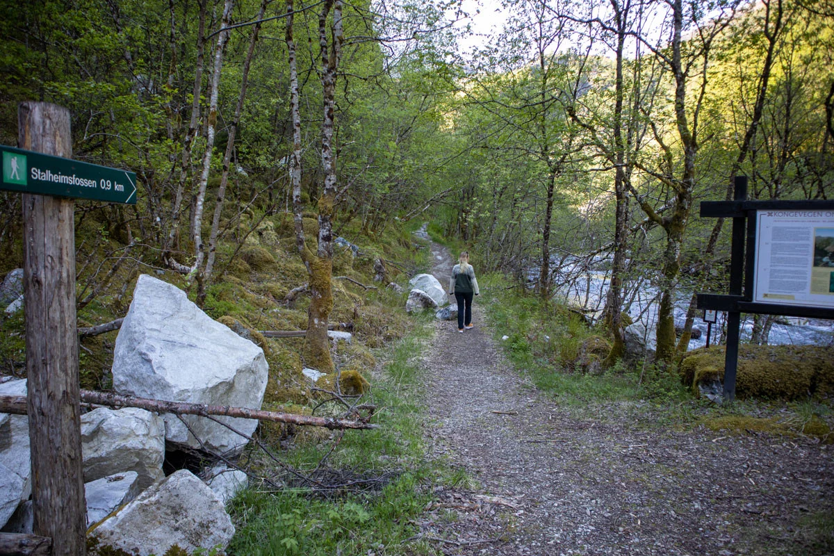 Følg Stalheimskleiva (svingene) ned til broen. Like etter broen på høyre side går det sti skiltet "Stalheimsfossen". Gå stien helt til enden og du kommer til fossen.