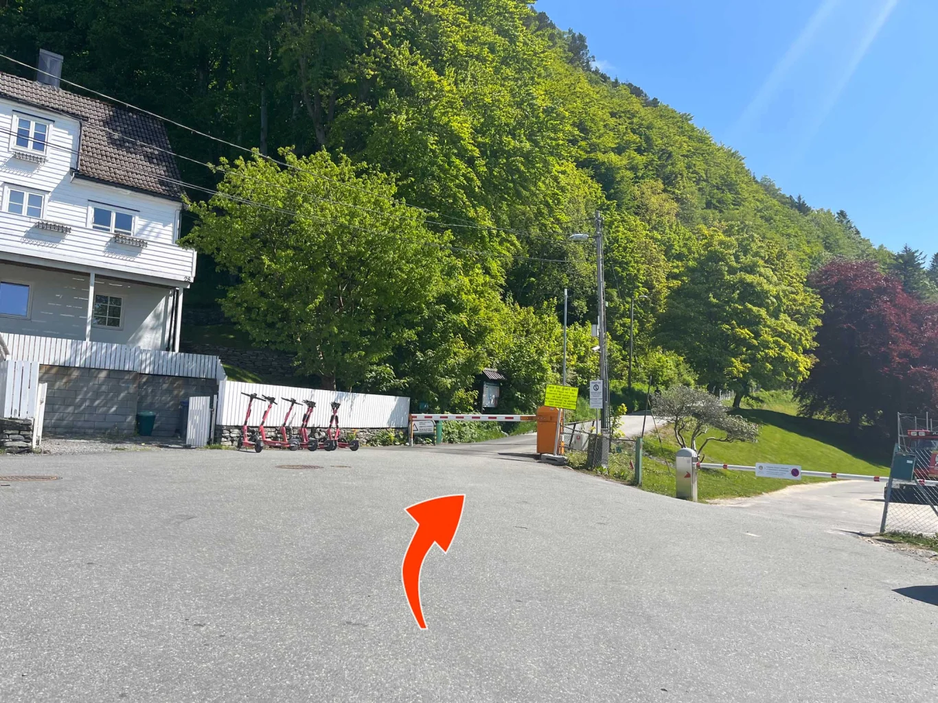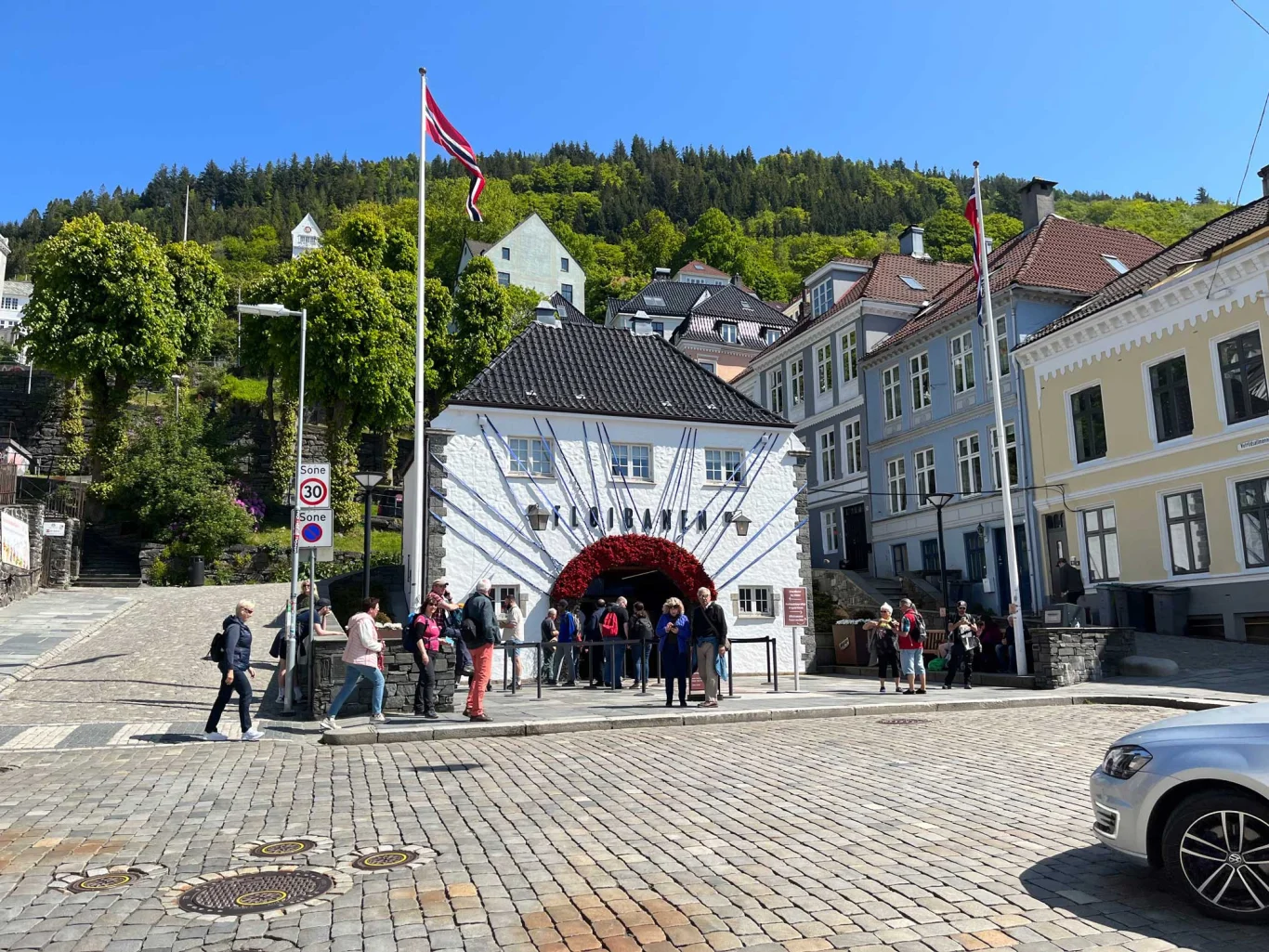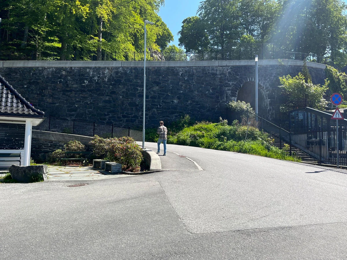 Turen til Fjellhytten på Fløyen starter ved Fløibanens nedre stasjon. Gå opp svingene mot Skansen Brannstasjon og videre langs Skansenbakken.