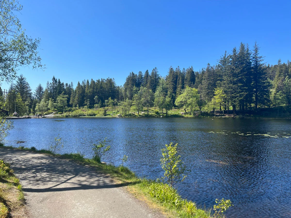Ta til venstre opp Skansemyrsveien, gjennom bommen ved Skansemyren Idrettsplass og opp veien mot Skomakerdiket. Dette er den velkjente traseen fra Sykkel-VM i 2017 hvor tusenvis av bergensere omringet løypen og heiet syklistene frem. Ta til høyre ved skilt mot Skomakerdiket. Skomakerdiket tilbyr mange aktiviter om sommeren, som kanoutleie, grillmuligheter og svømming. I Skomakerstuen selges varme og kalde drikker og lett snacks.