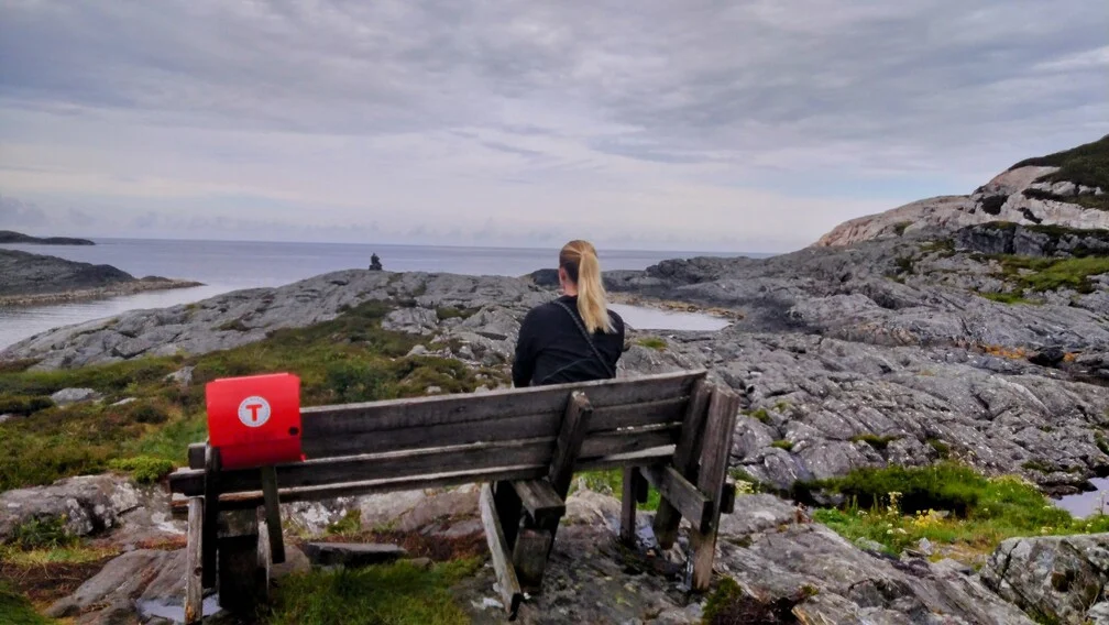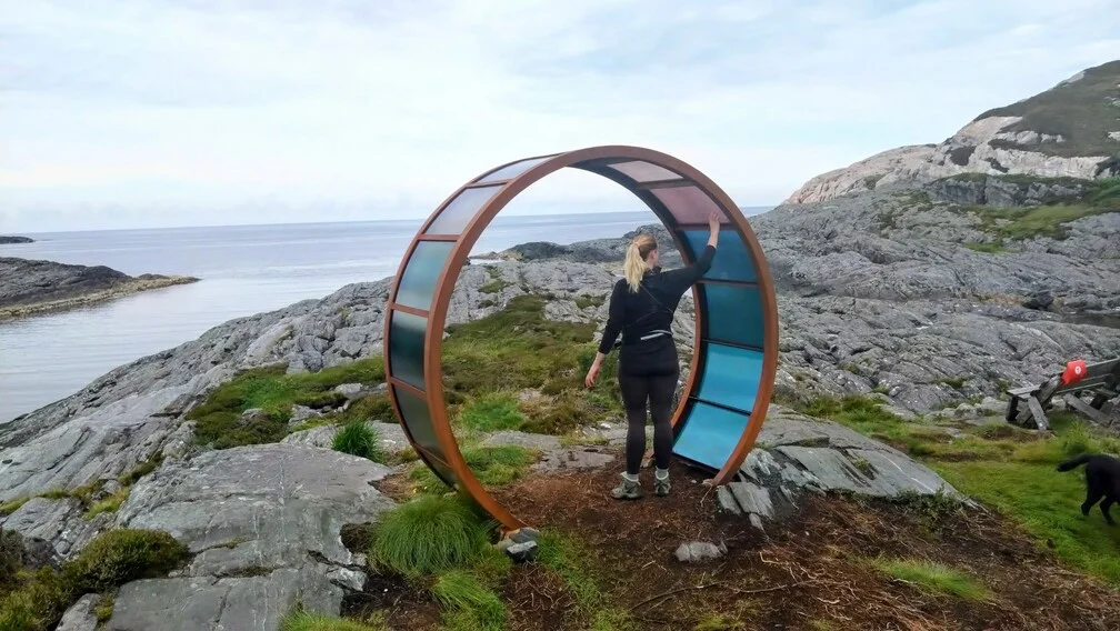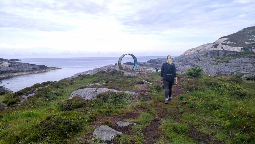 Turen går på god sti ut til havet. Her er en kunstverket "Livets Portal" med svaberg og utsikt mot havet.