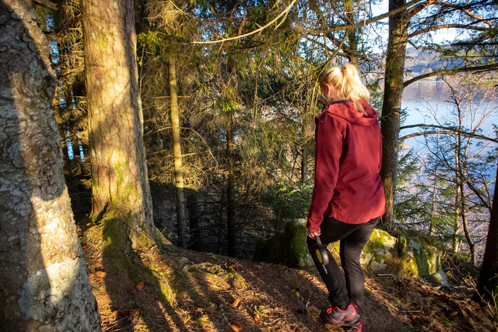 Fra dette stedet er stien noe utydelig, men du kan enten gå rett frem som vist på GPS-spor, eller ned mot venstre. Stiene på begge sider blir tydeligere like før du ankommer neset.
