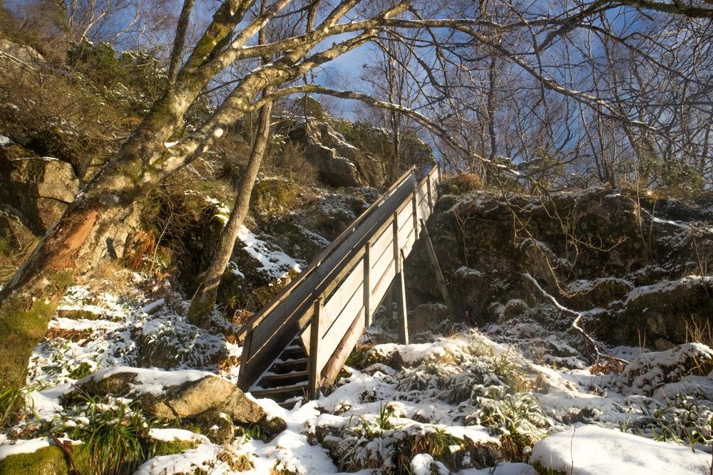 Når du kommer opp dit går du til venstre til øverste delen av vannanlegget. Nå er det slutt på veien og turen går over på sti. På venstre side går stien bratt opp. Følg den opp tretrappene. Om vinteren kan det være glatt her så husk brodder.