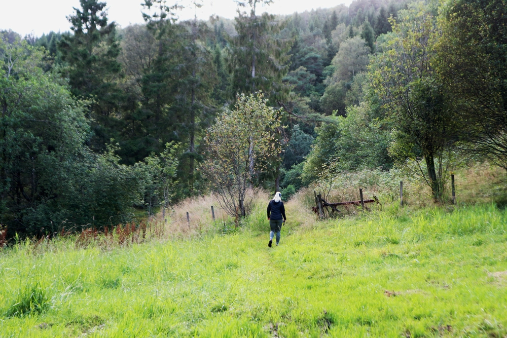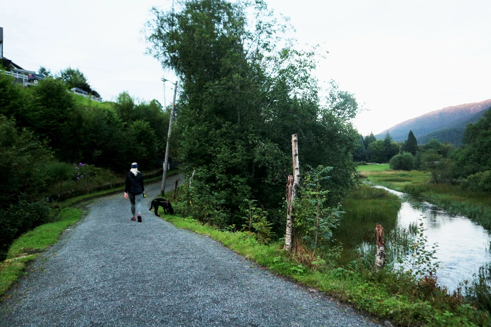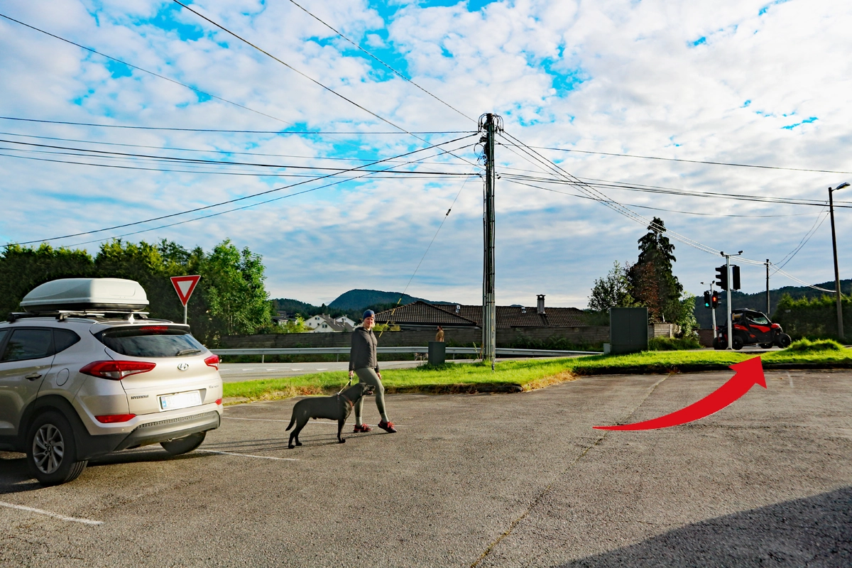 Fra parkeringen ved søfteland skule krysser du hovedveien og går inn på sideveien som leder deg ned i Internatvegen.