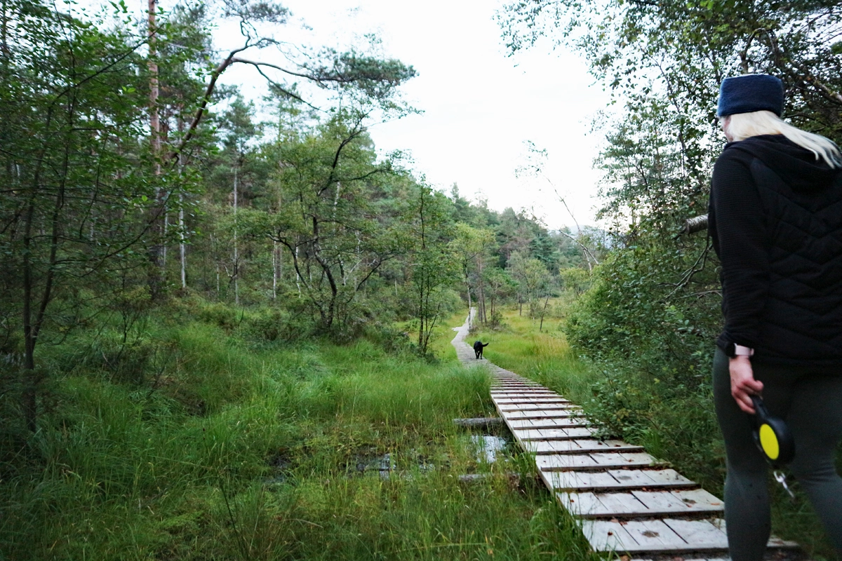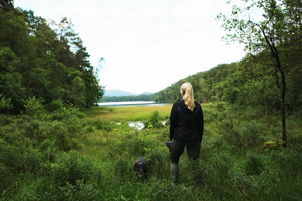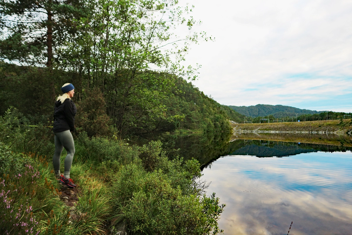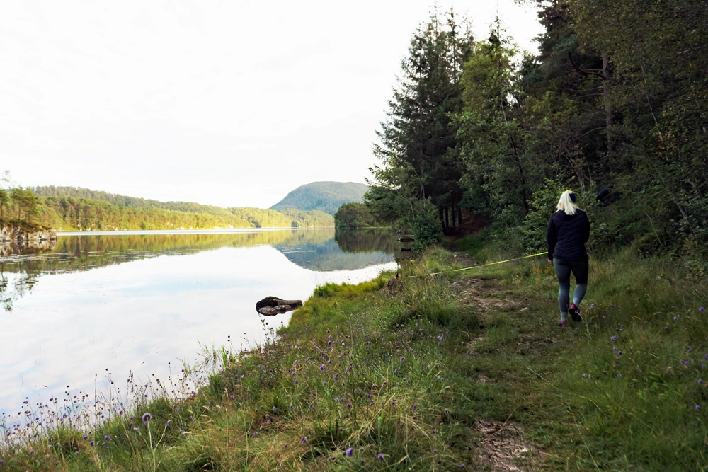 Følg stien langs vannet. Stien er tydelig men det er mange bløte partier. Stien leder deg til enden av vannet og du krysser over på andre siden hvor Kvernatjørna og Vindalsvatnet møtes. Du kommer nå inn på en skogsvei. Du kan enten gå til venstre (som GPS sporet viser) eller til høyre. Begge veier leder til Hetleflåten. Turen fortsetter videre på asfaltert vei. I neste kryss går du til venstre opp bakken. Fortsett forbi alle privatboligene og i enden er det ny traktorvei. Gå gjennom grinden og følg veien nordover. Gå gjennom ny grind og fortsett over den lange trebroen som Os turlag har bygget. Nå er det bare å gå rett frem de siste 2 km. som leder frem til Byvegen.